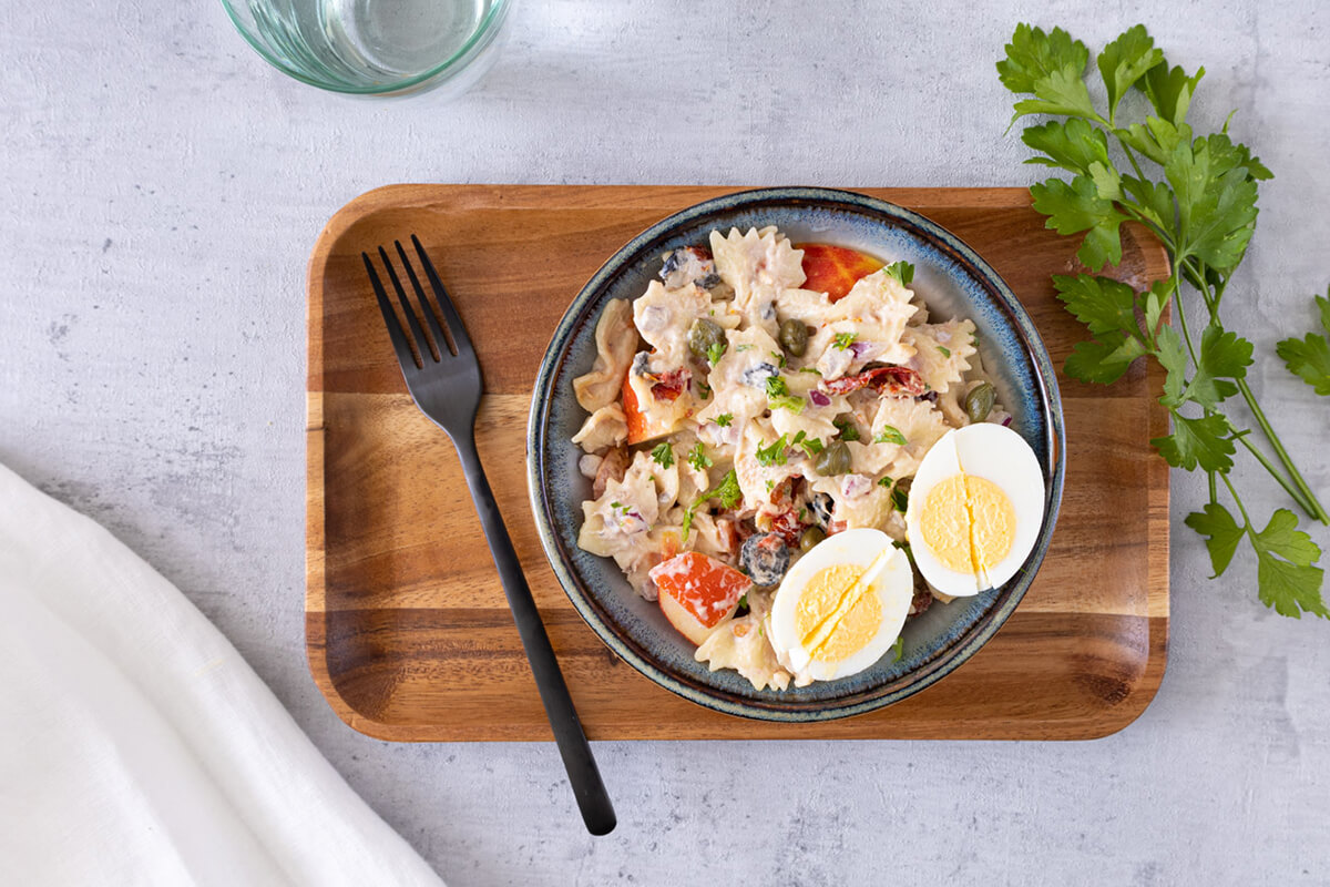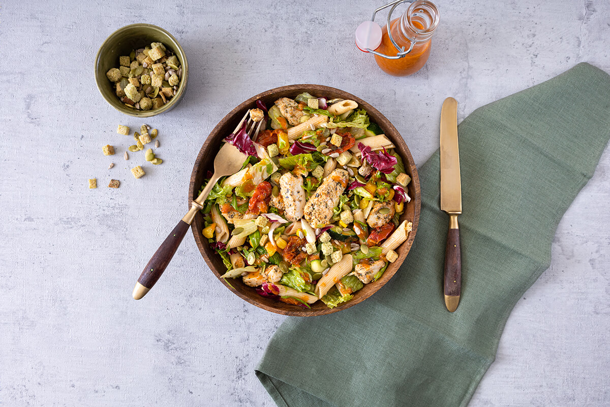 Carbohydrate salads are salads with their main component being a carbohydrate source. Most common variants contain pasta, but potato or grains are also possible. The combination of carbs with fresh-cut vegetables, a protein source, good quality dressings and toppings make these salads a versatile product. Use it for lunch, dinner, side, snack or at a BBQ! Our best rotators are the Pasta Pesto salad or Pasta Chicken & Bacon salad. Upon request we can make any possible variant to meet the consumer demand.